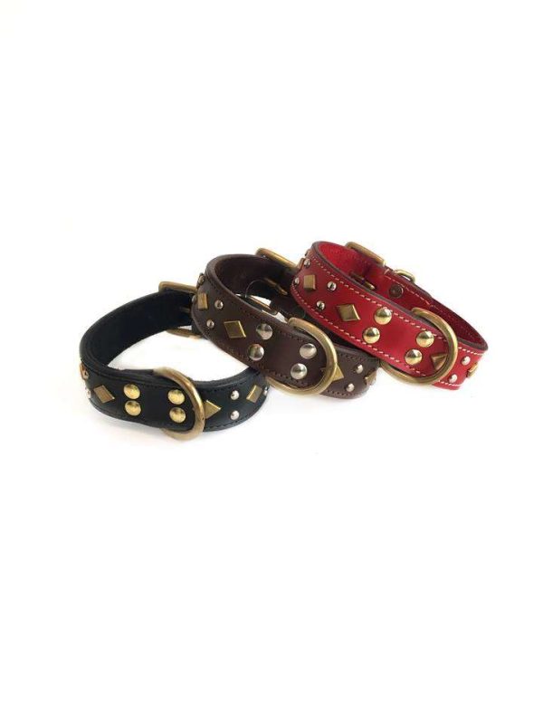 Ett rejält läderhalsband med dubbla silver och guldnitar.